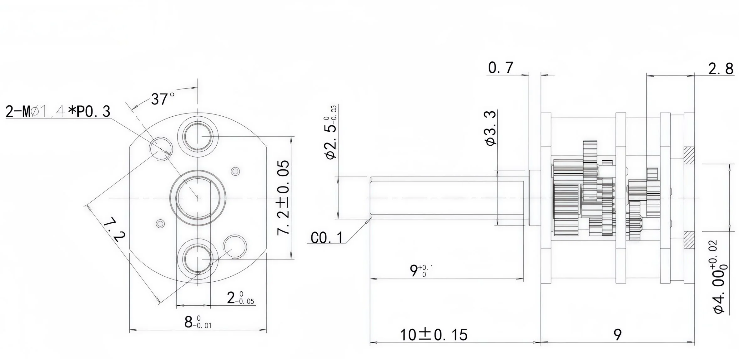 | Index | Gear Ratio | Actual Ratio | Stages | Overall Size | Output Direction | Motor Gear Teeth | Motor Gear ID (mm) | Rated Torque (g·cm) | Allowable Peak Torque (g·cm) |